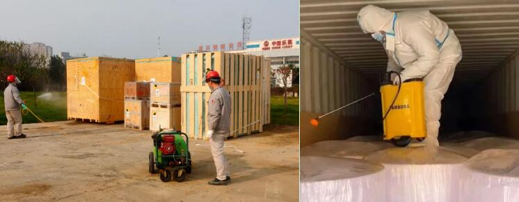 中國樂凱集團公共事業(yè)部嚴格落實防疫要求,進口到貨采取“多重消毒”,即進口集裝箱進入卸料區(qū)后,由消毒人員對車輛和集裝箱進行整體的外部消毒;打開集裝箱箱門后,消毒人員進入集裝箱,對箱內(nèi)貨物進行二次消毒 ,貨物卸車后消毒人員對貨物進行全方位消毒。中高風險區(qū)到貨采取卸貨后集中全方位消毒。
